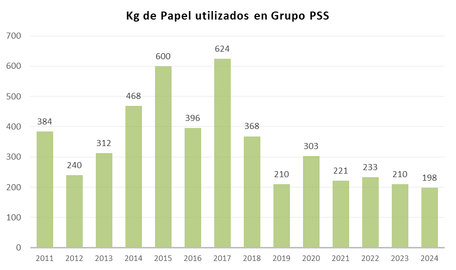 Para reducir el impacto ambiental de nuestro consumo de papel, desde hace unos años, PSS ha optado por la adquisición de papel con un gramaje de 75 gr en vez del habitual de 80 gr