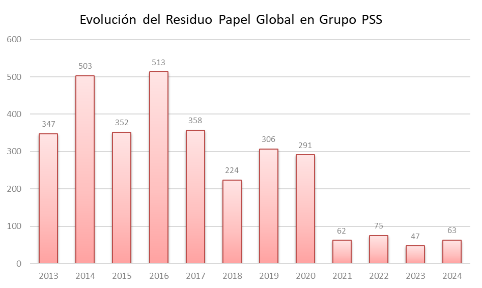 Grupo PSS lleva un estricto control sobre sus residuos de papel. El 100% del papel que generamos de nuestra actividad, se separa del resto de residuos y se destina a tratamiento adecuado